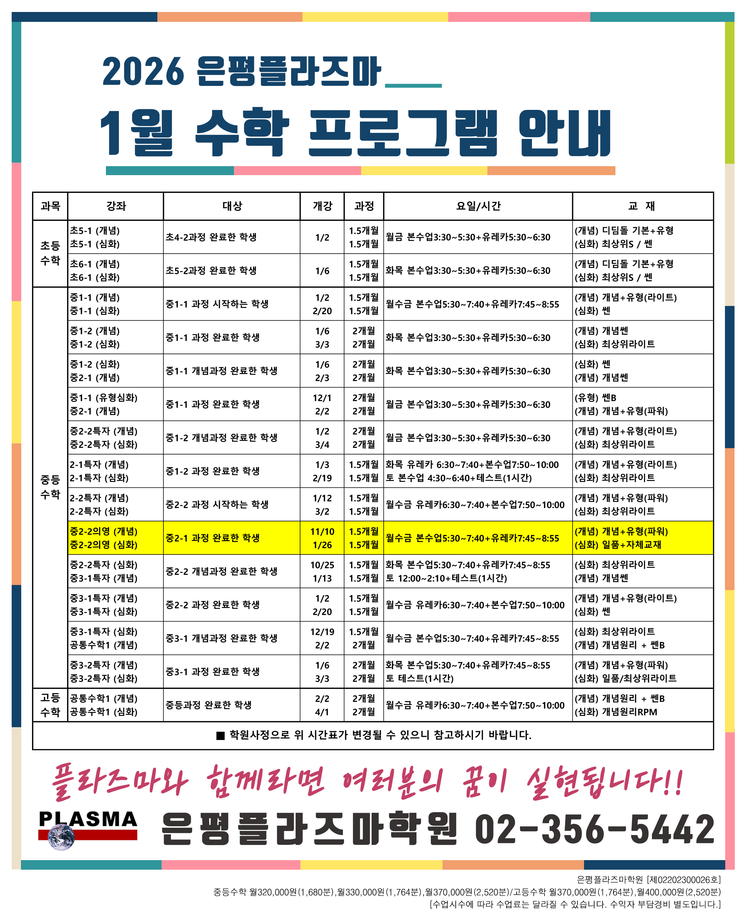 중2-1 화목 6:30-10:00, 토 4:30-6:40+테스트(1시간) 1/3(토) 개강 (주3회)