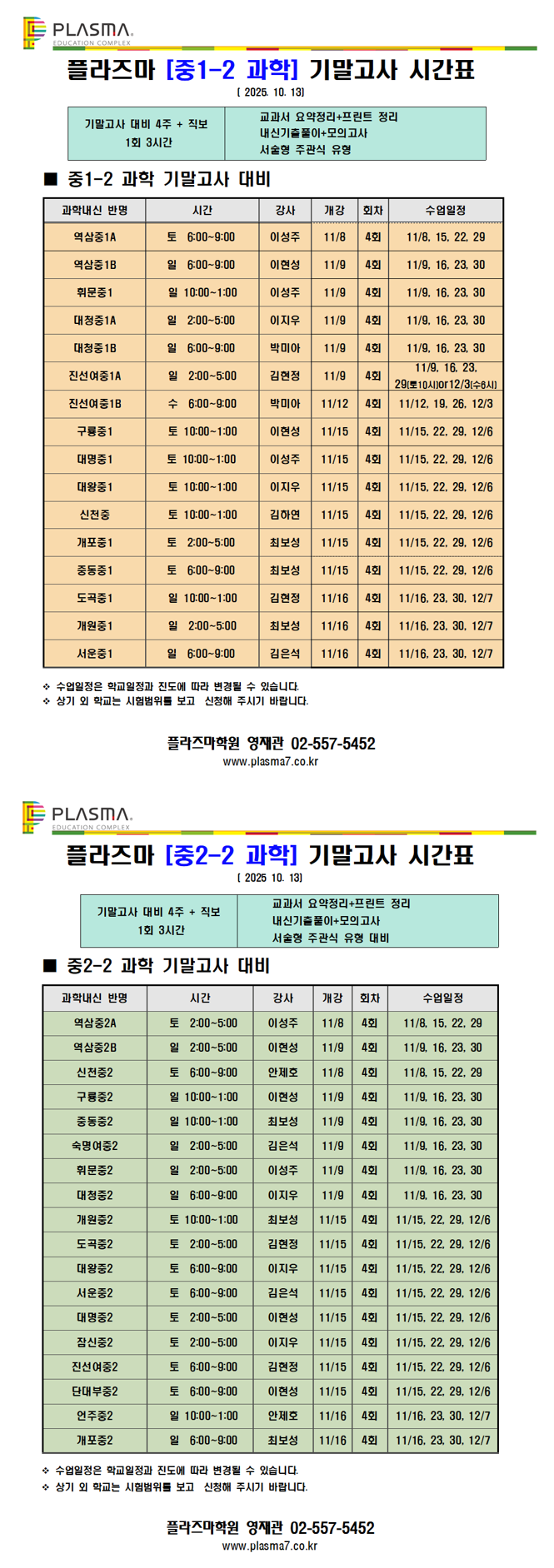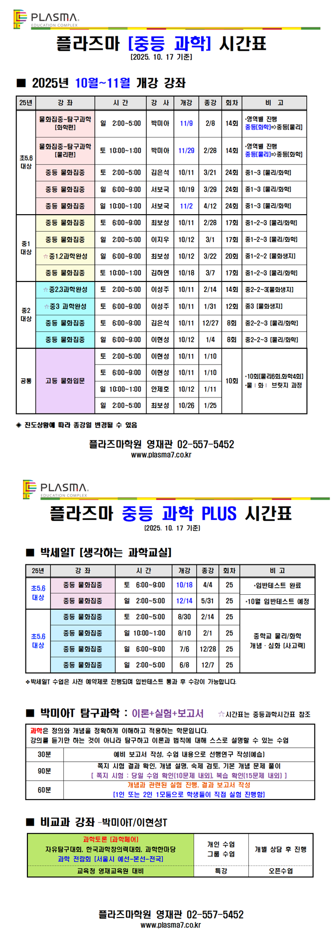 [플라즈마 영재관] 중등과학 10~11월 시간표