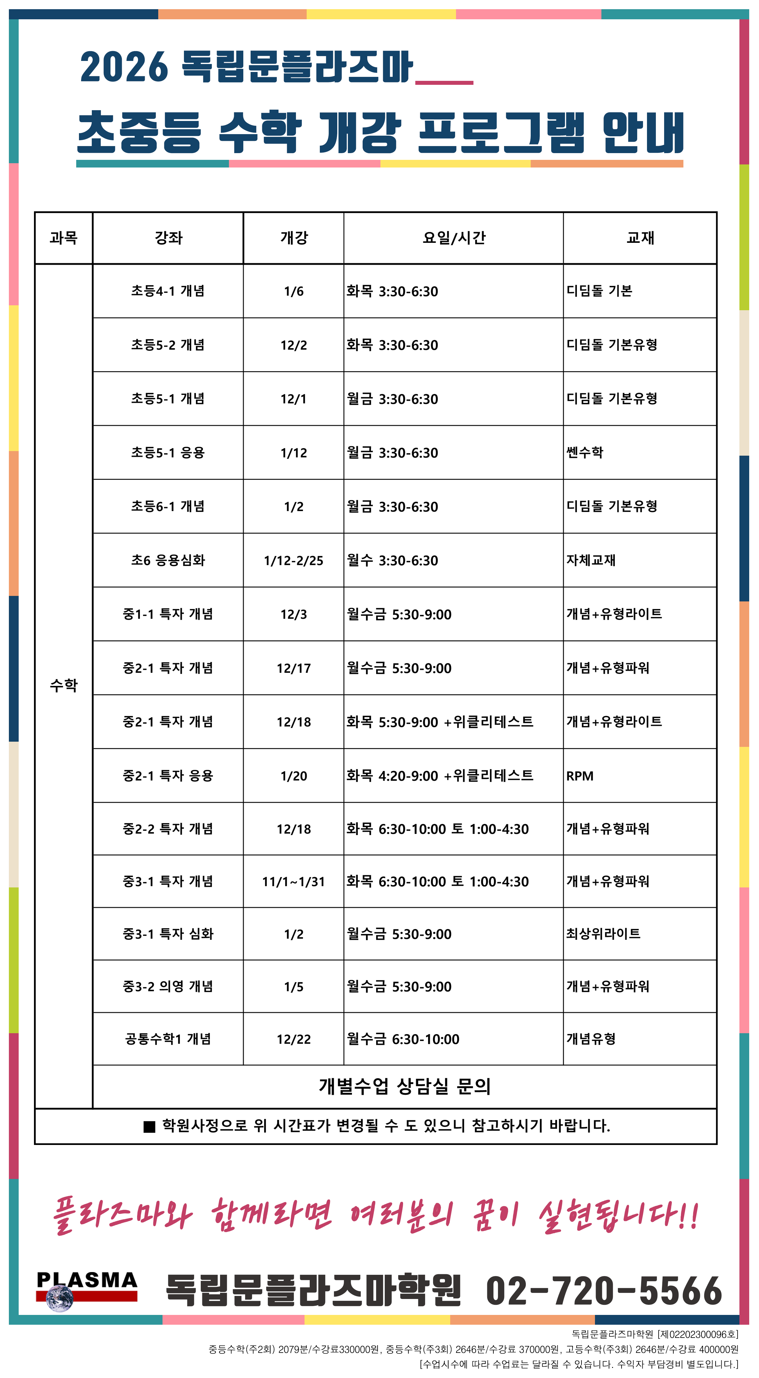 시간표를 확인하신 후 상담/문의 바랍니다.