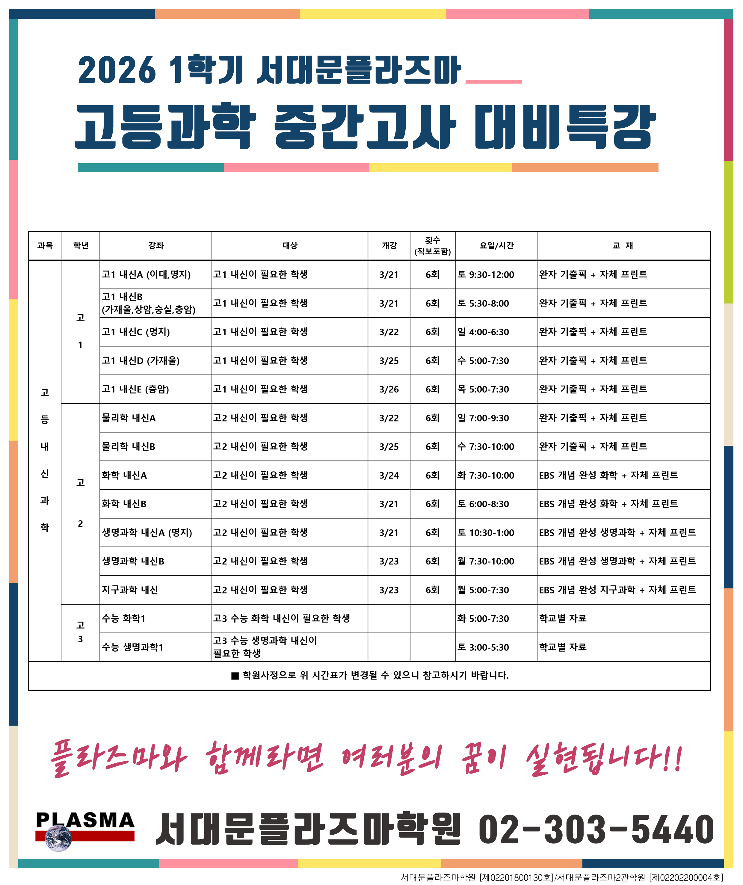 서대문플라즈마에서는 1학기 중간고사를 대비하기 위한