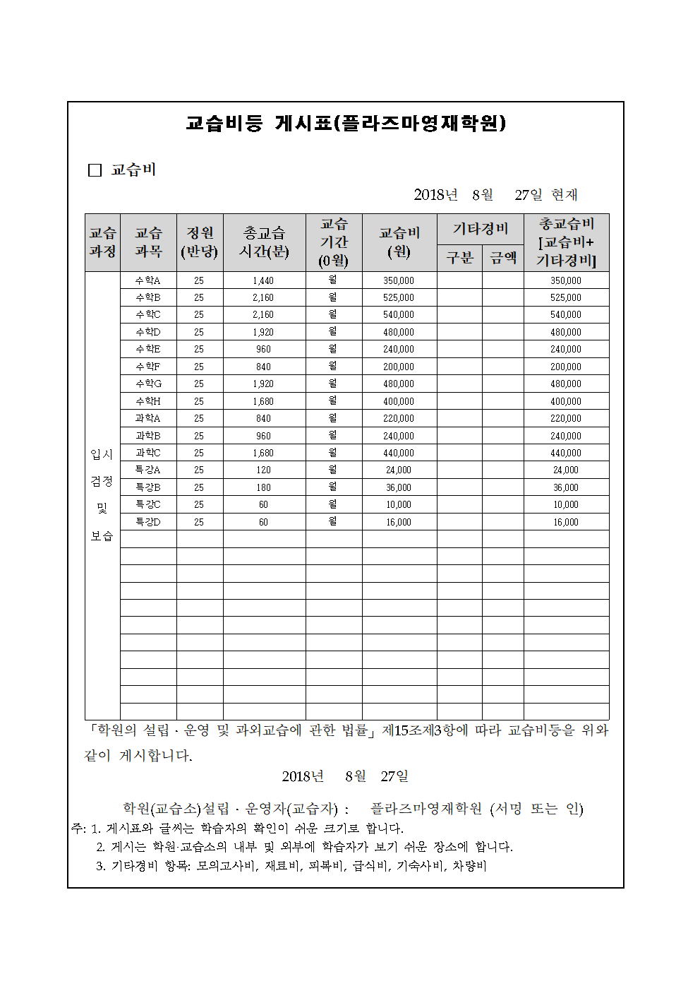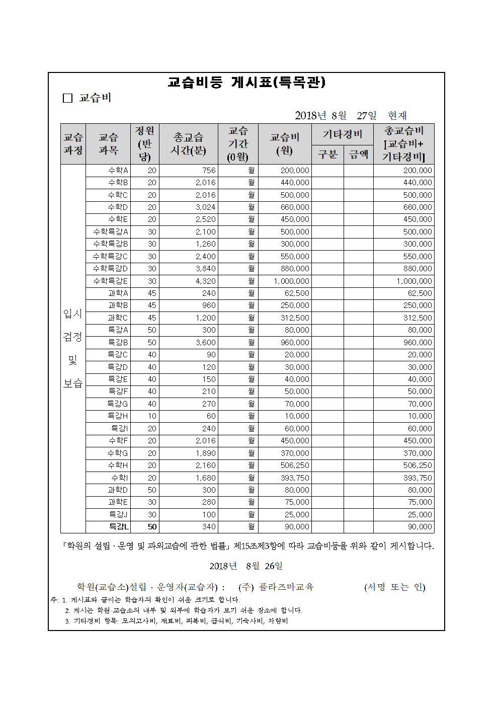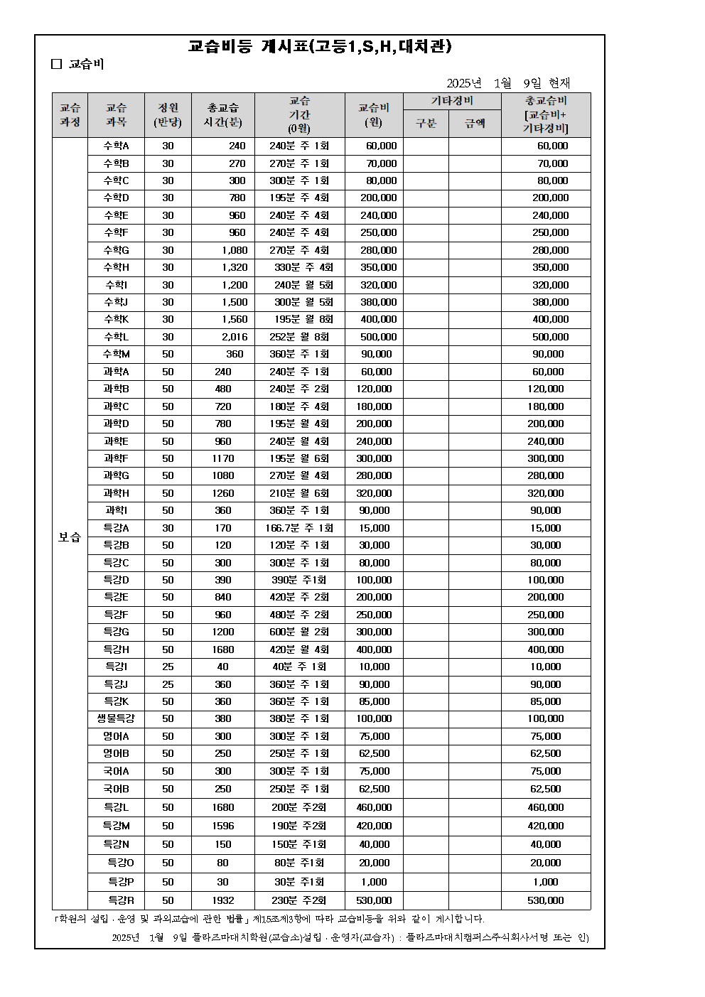플라즈마학원 교습비