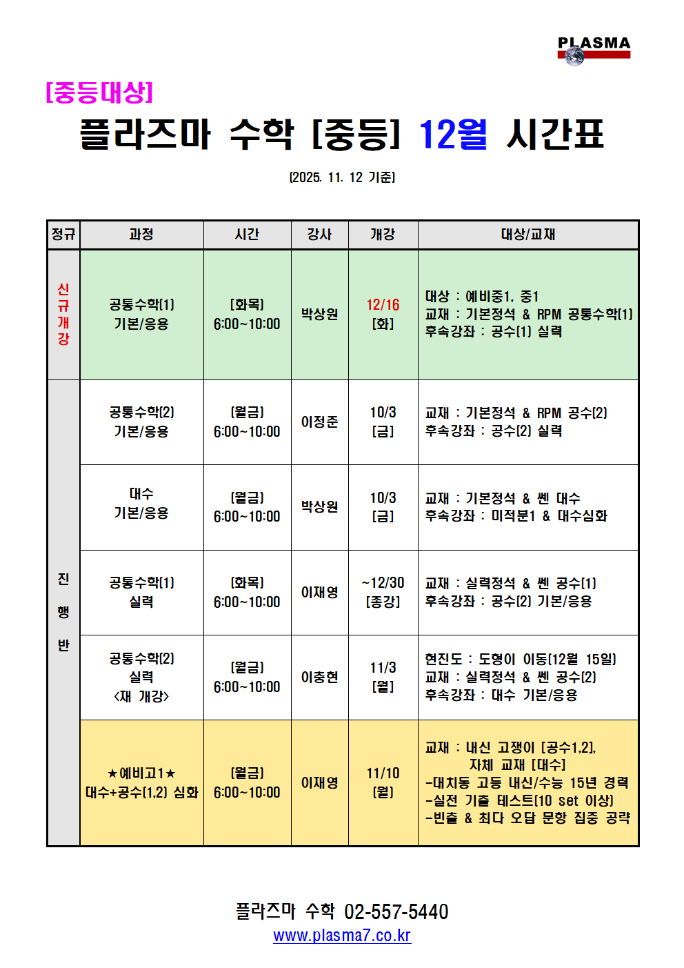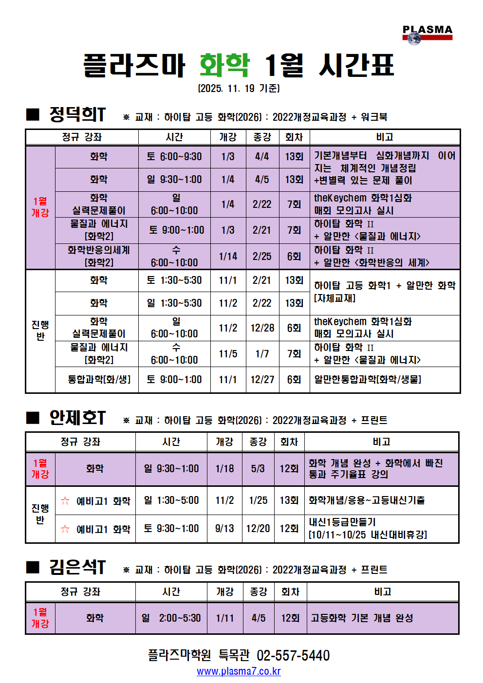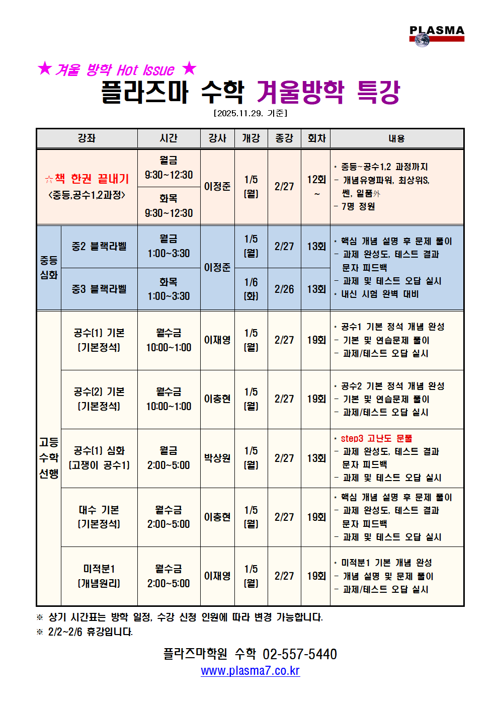 [플라즈마 영재관] 중등과학 12~1월 시간표
