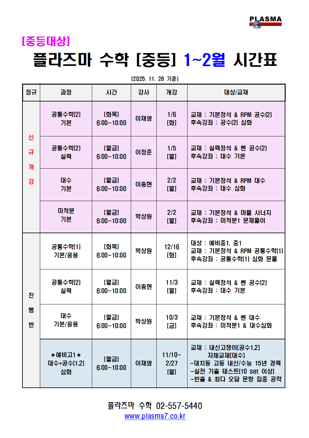 [특목관] 중등수학 특강시간표