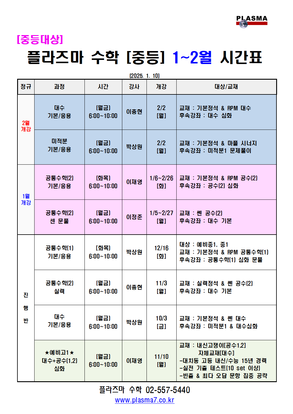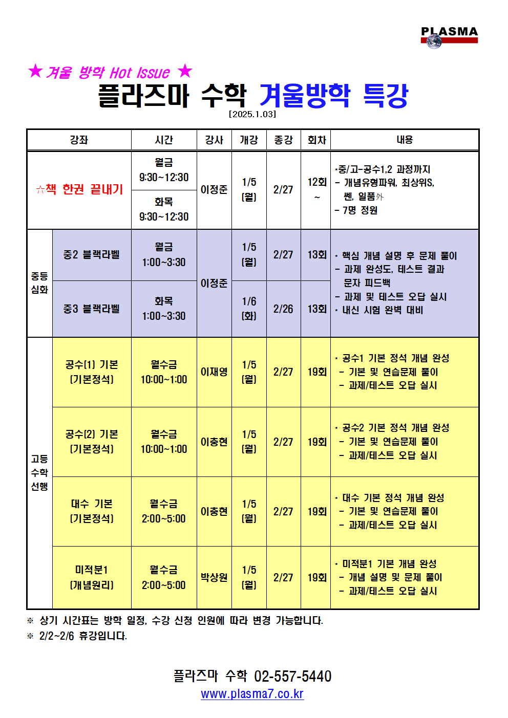 [플라즈마 영재관] 중등과학 1~2월 시간표