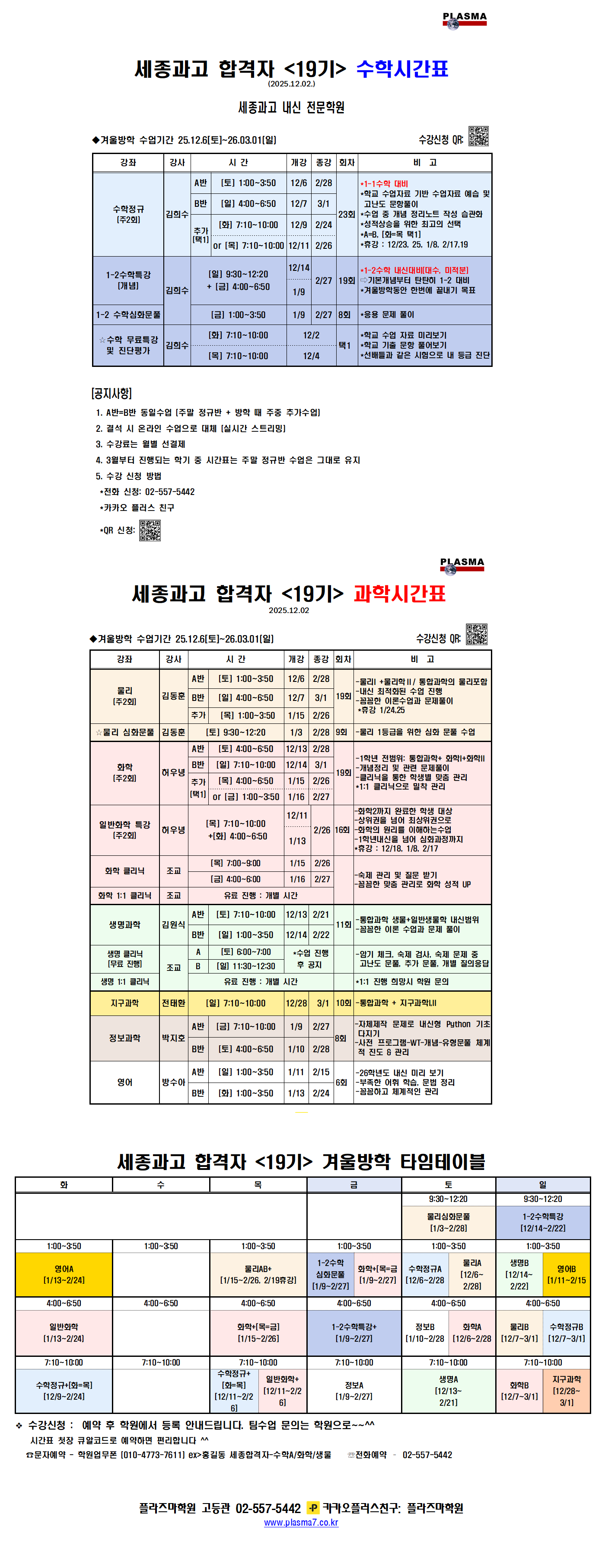 [플라즈마 고등1관] 예비세종1 겨울시간표